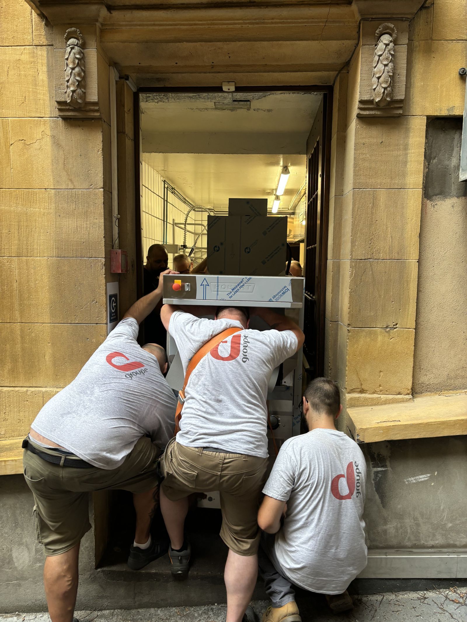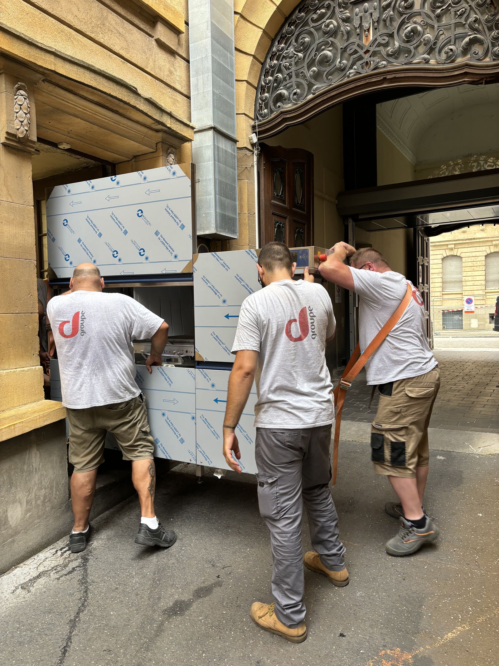 La fermeture du restaurant en fin de semaine a permis la livraison et l'installation d'un nouveau lave-vaisselle au sein de votre restaurant. Une opération pour les costauds !